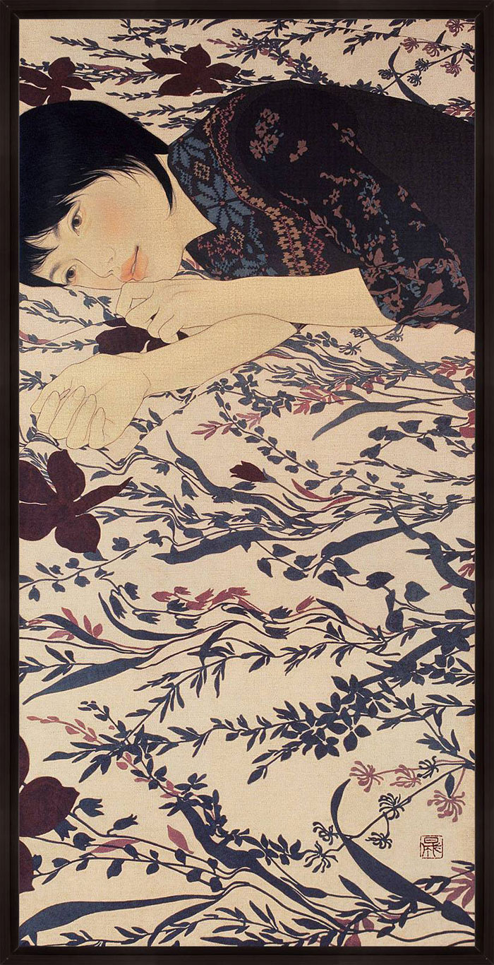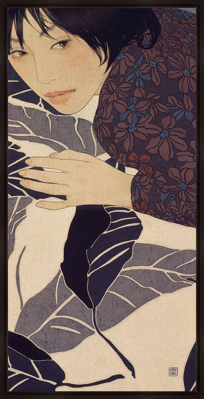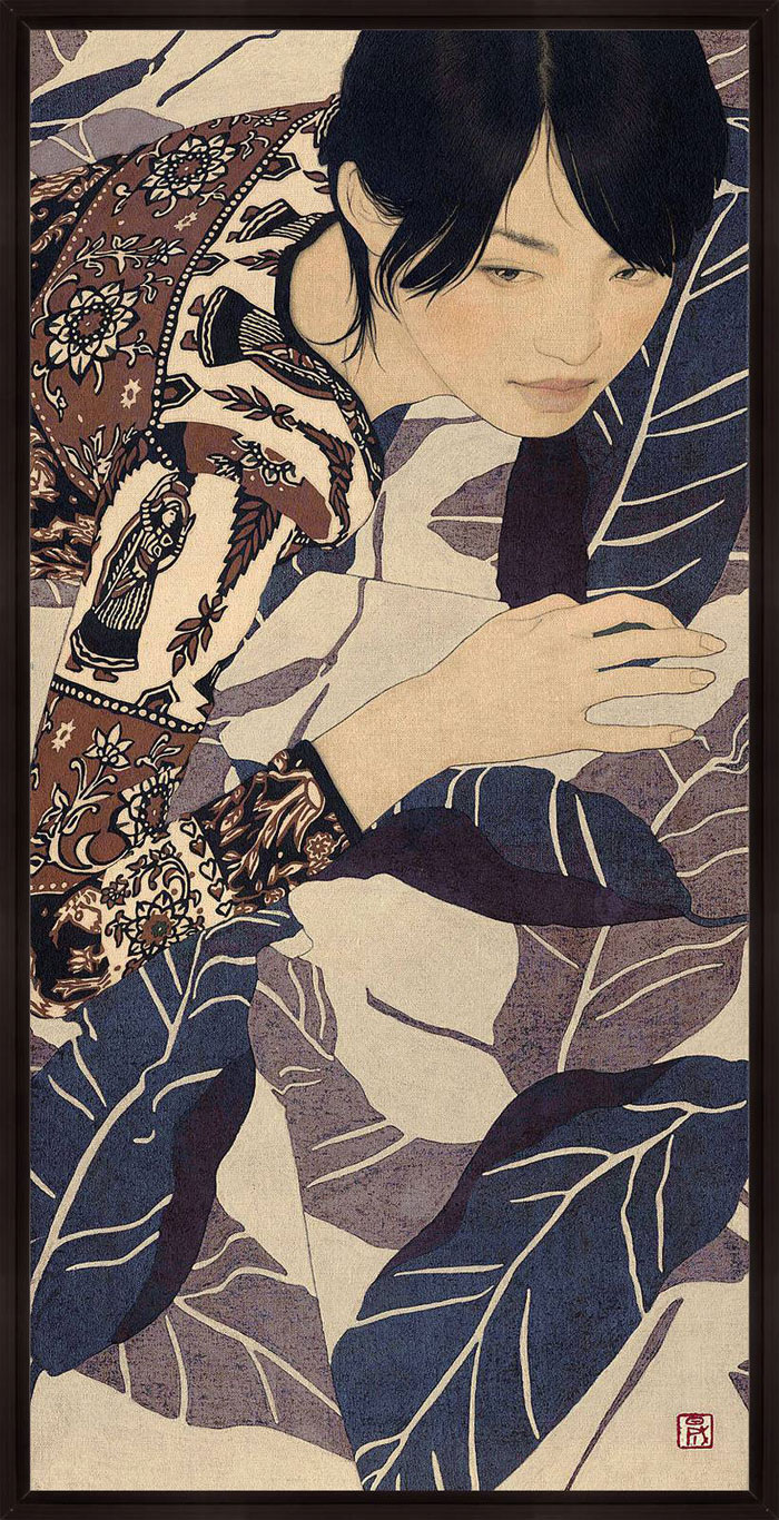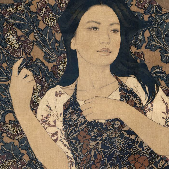 “Using the simplicity of Indian ink and linen canvas Ikenaga Yasunari has captured a simple serenity in the the faces of his female portraits.This calm sensuality is highlighted by the richness of their surroundings. Yasunari’s Japanese heritage has inspired a style of painting which is characteristic in his work. This ancient technique of Nihonga is a traditional Japanese art form using a Menso brush and ink. With this Yasunari has successfully captured an essence of the past with a pallet of muted tones , but has injecting a modern twist to each piece with his use of pattern and cloth.”