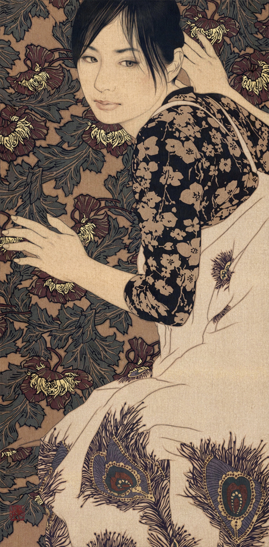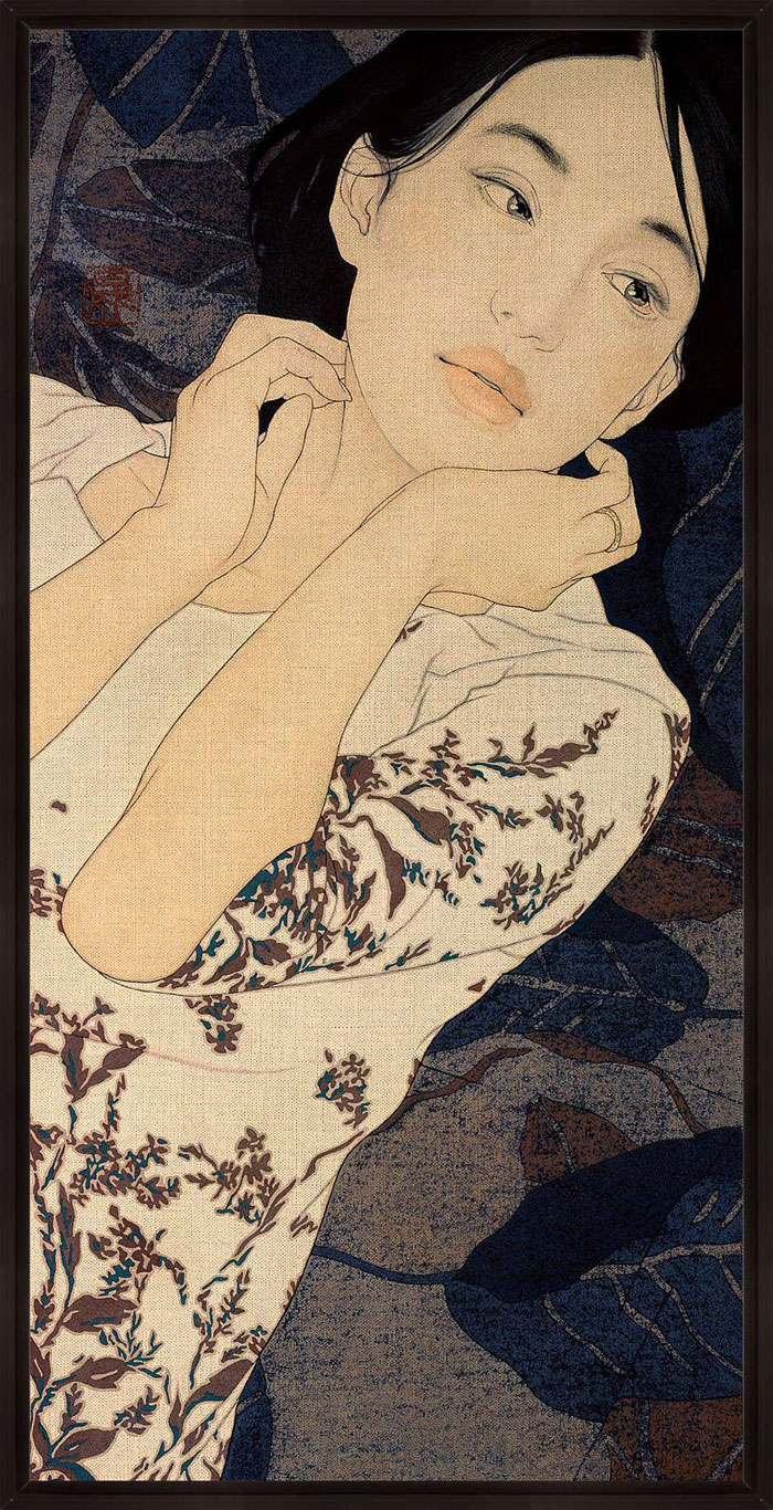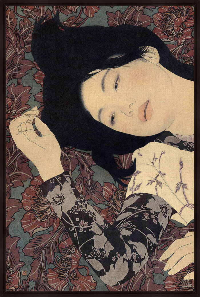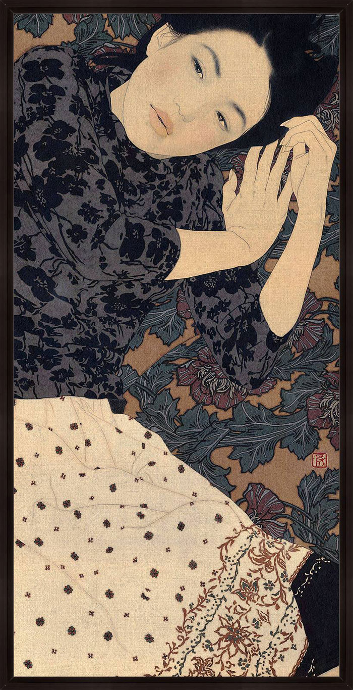 “Using the simplicity of Indian ink and linen canvas Ikenaga Yasunari has captured a simple serenity in the the faces of his female portraits.This calm sensuality is highlighted by the richness of their surroundings. Yasunari’s Japanese heritage has inspired a style of painting which is characteristic in his work. This ancient technique of Nihonga is a traditional Japanese art form using a Menso brush and ink. With this Yasunari has successfully captured an essence of the past with a pallet of muted tones , but has injecting a modern twist to each piece with his use of pattern and cloth.”