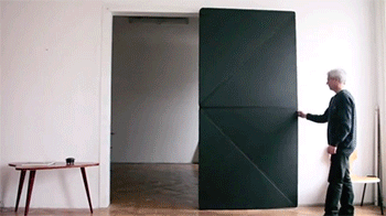 “Klemens Torggler’s door is an invention based on rotating squares, The special construction makes it possible to move the door sideways without the use of tracks. This technical trick opens up new applications for the door.”