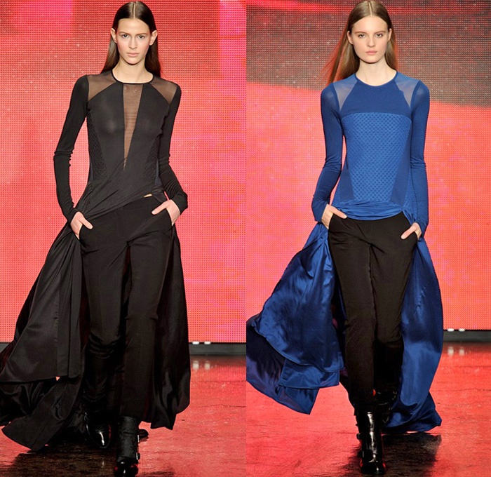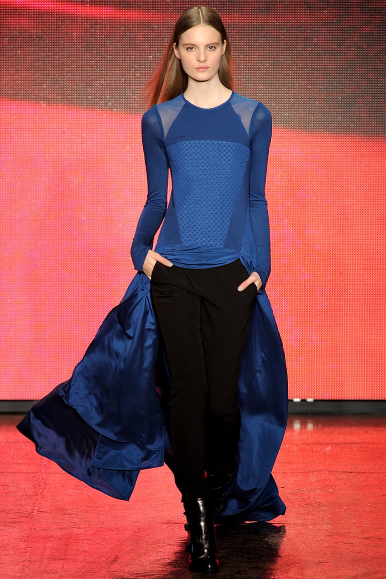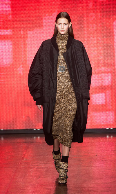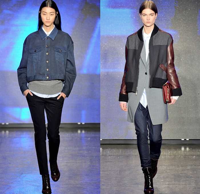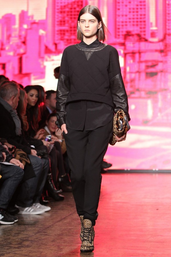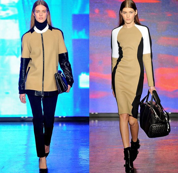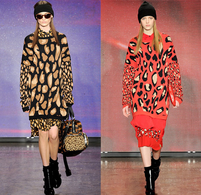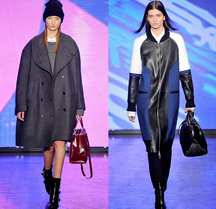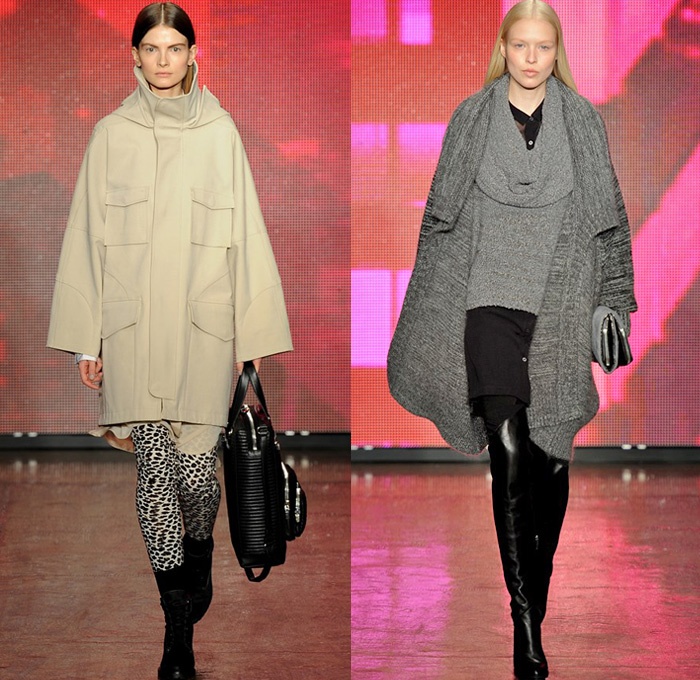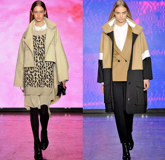 “DKNY exhibited their 2013-2014 Fall Winter Womens Runway Collection during New York Fashion Week. On the catwalk ensembles, Donna Karan focused on oversized outerwear coats, parkas, anoraks and bomber jackets. The main design element seen was multi-paneled fabrics and textures with color blocking effects. Denim and jeanswear were a few as evidenced in an oversized crop top denim jacket and slim pants. Colors used were ivory, khaki, camel brown, tomato red and cobalt blue. Animal prints were also spread out with leopard and cheetah patterns mostly in sweater pullover jumpers, skirts and jackets. Quilted panels also mixed well with black fabrics on outerwear. From the presentation, we selected the top looks and our favorite pieces. ”