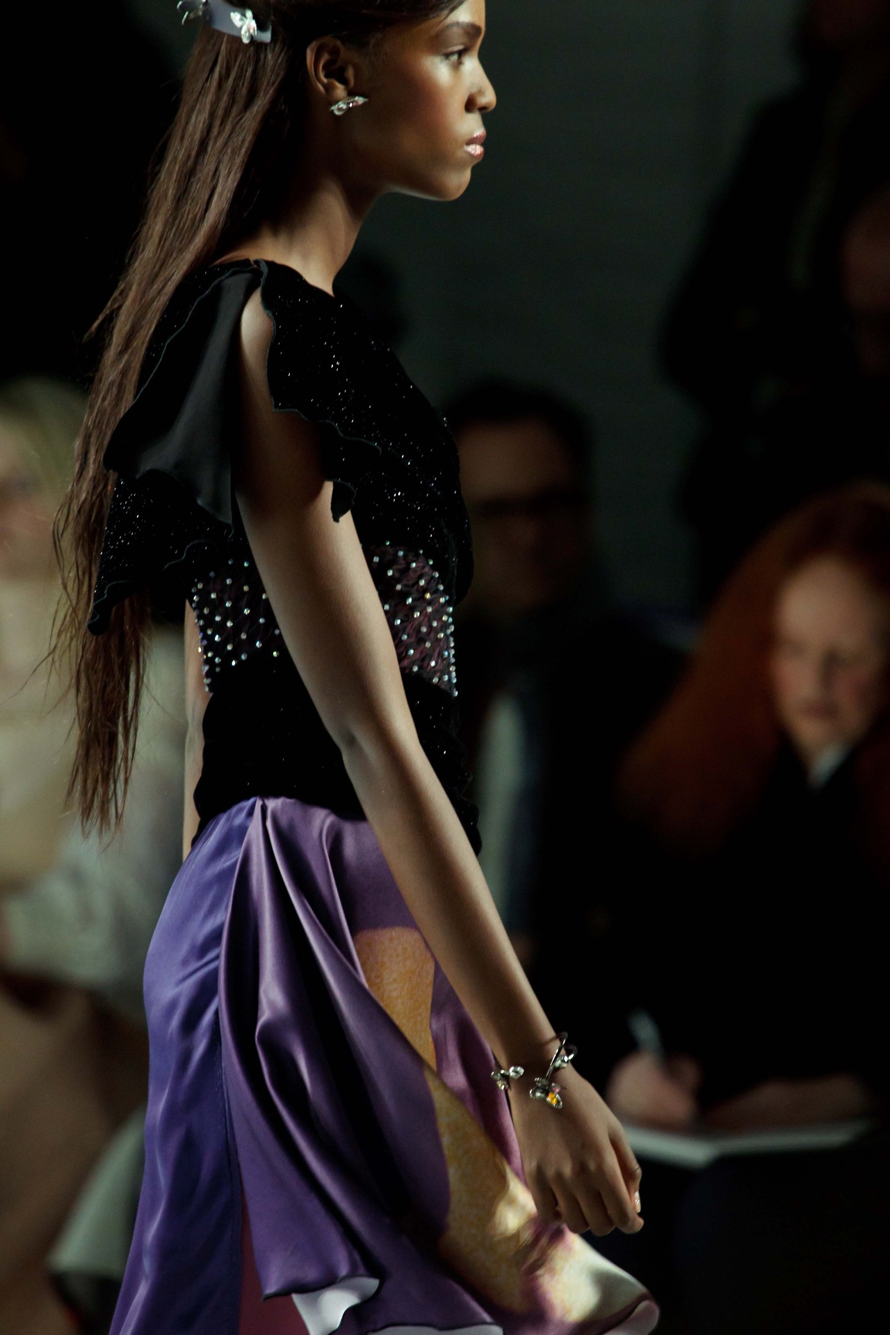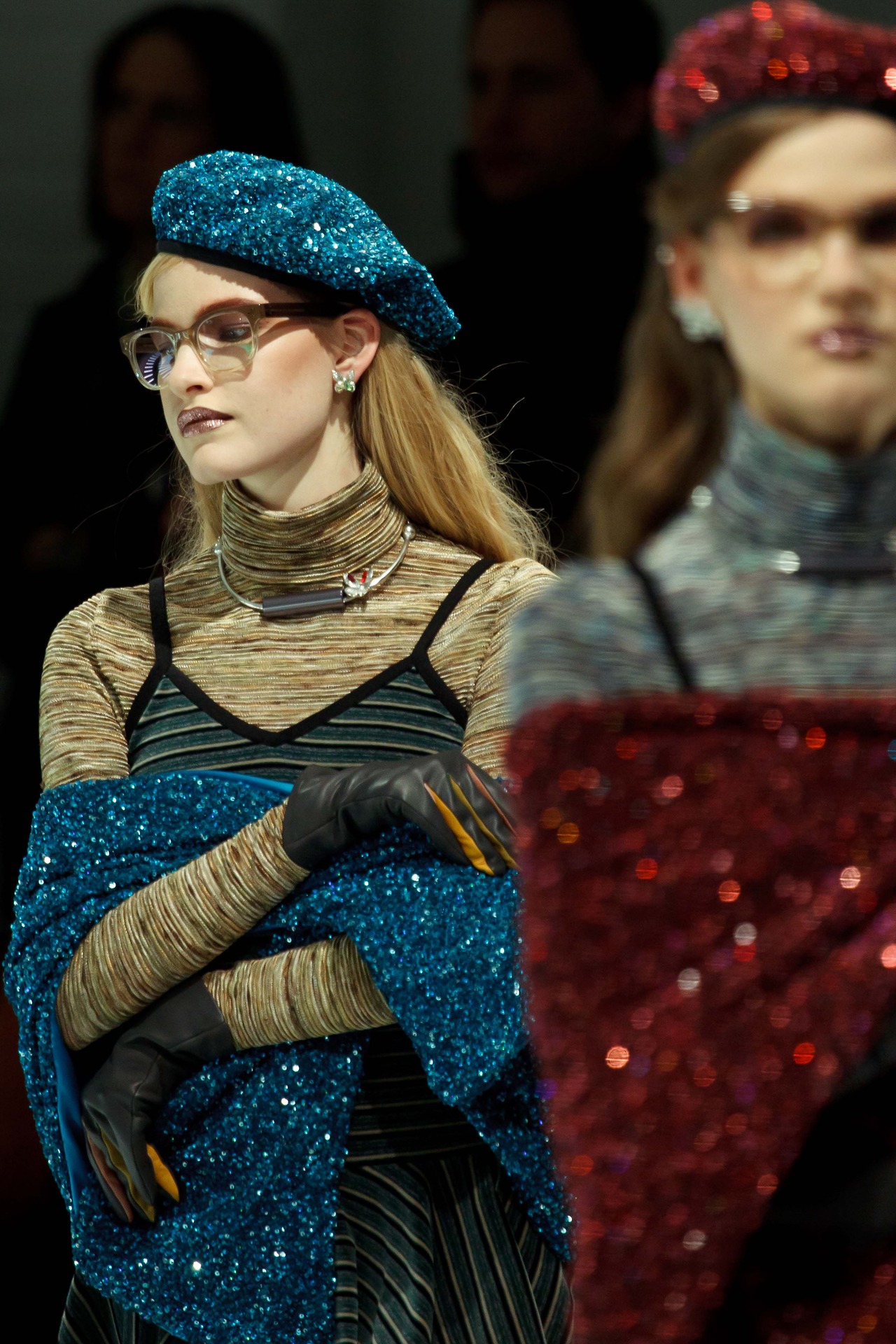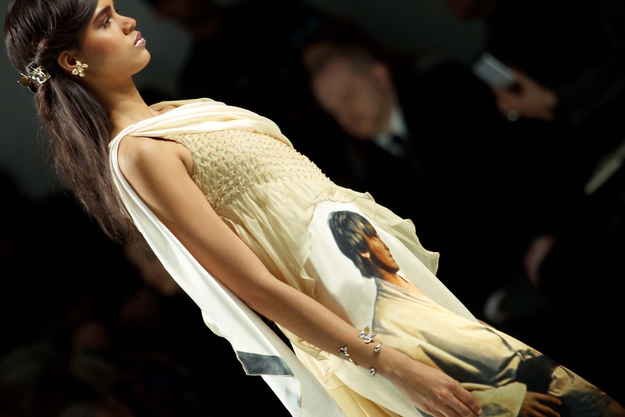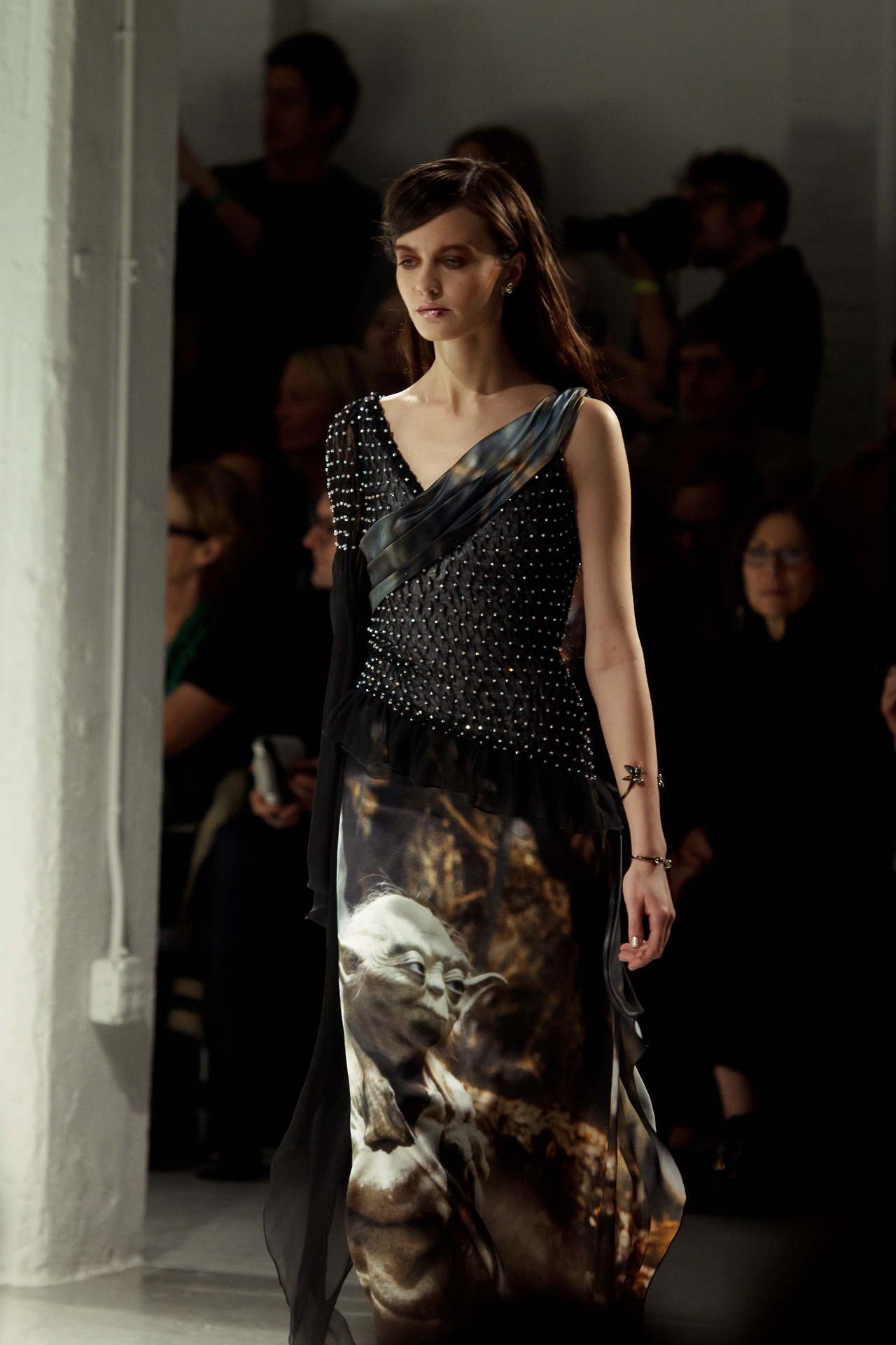 The collection had a nerdy chic and fantasy theme. Long gowns and glasses. Starwars prints featured on pieces stamp a nostalgic look back at pop culture and glamour.