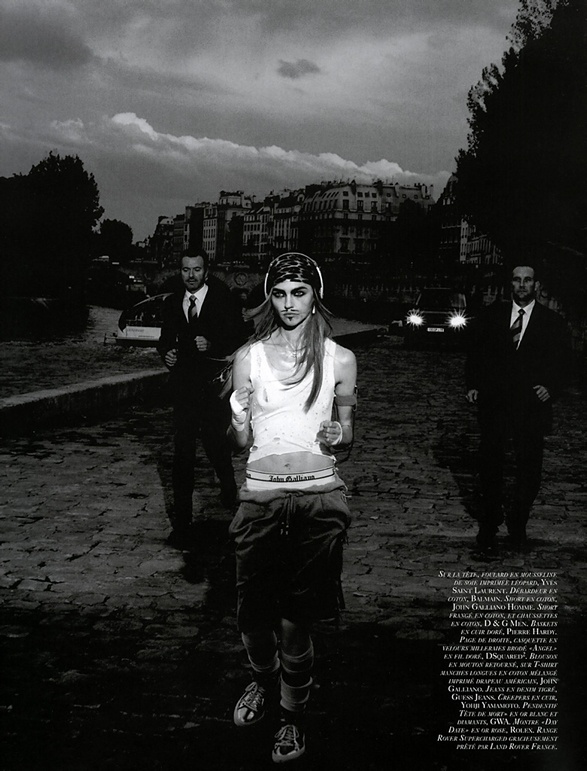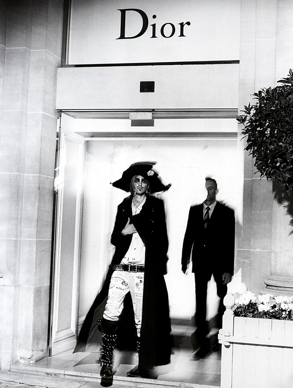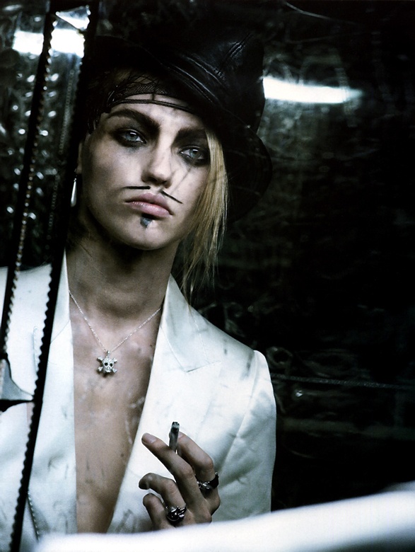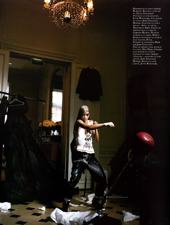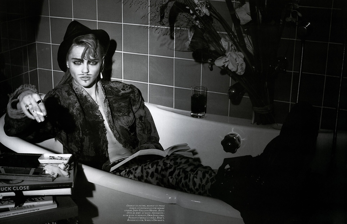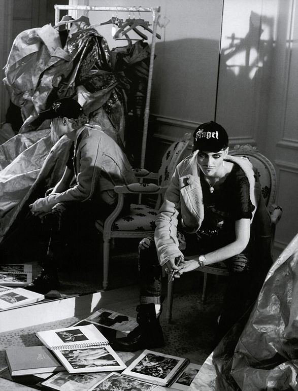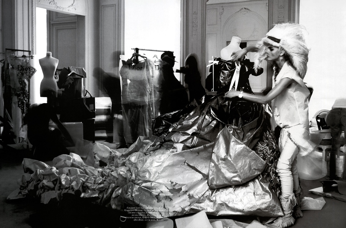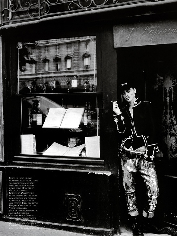 A Photoshoot for Vogue Paris by photographer Peter Lindbergh featuring the model Sasha Pivovarova. The whole set was an homage to famed and eccentric DIOR designer John Gallioano. Mainly focusing on the behind the scenes of the designers work. Thin mustache, dramatic outfits and smoking.